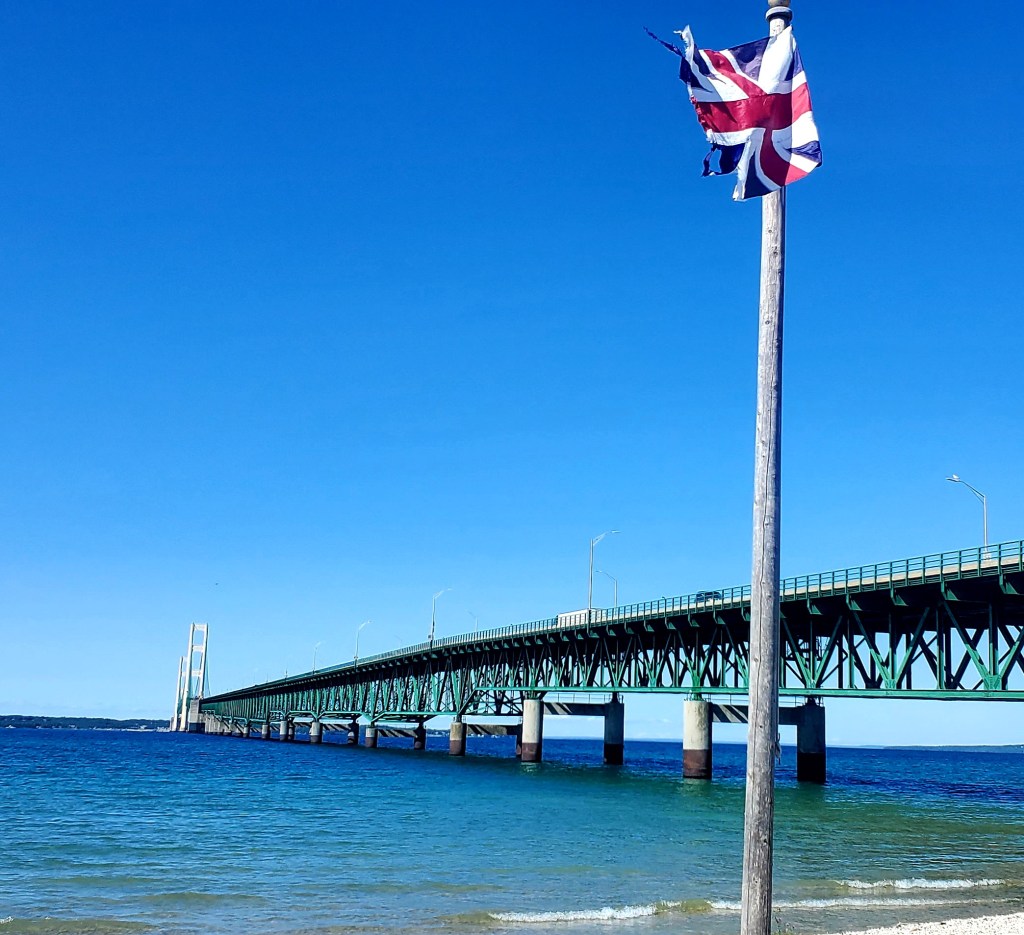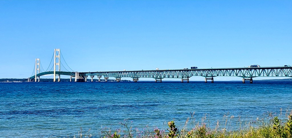 Mackinac Bridge is five miles long and connects Michigan’s Upper and Lower Peninsulas. I always enjoy driving across it (and enjoyed walking across it once, during the annual Labor Day Walk.) I often stop on the northern end to admire the views. But until this trip, I never stopped at the southern end to admire the history. One more history gap filled in! 🙂