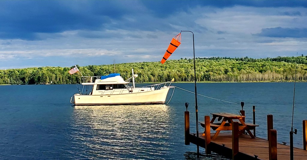 Mainship Many Moons sure looked great anchored off-shore at Camp Many Moons in about four feet of water. See how narrow Huron Bay is here near its head? That’s why some call it a fresh-water fjord.