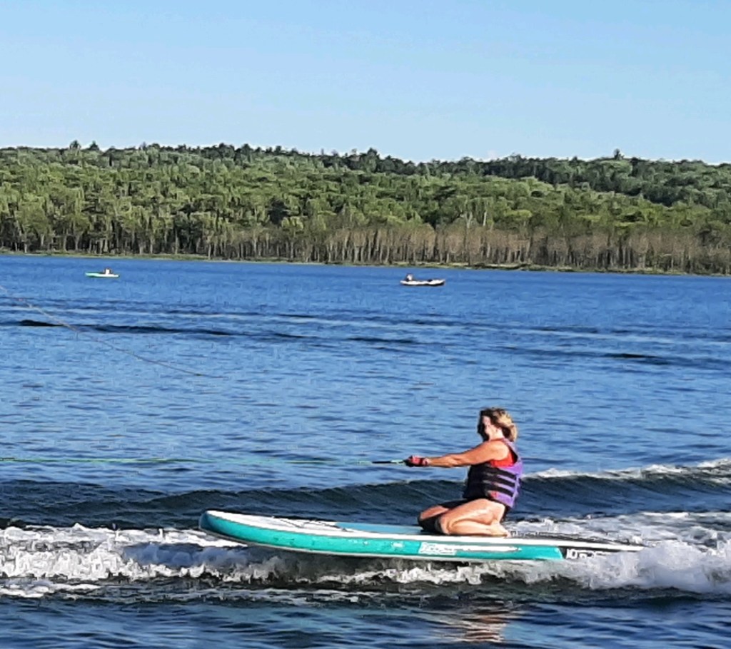 I didn’t invite Roscoe on this outing…a brand-new use (for me) of the paddle board. A jet ski is pulling me. I did manage to stand up, and even to steer it, for awhile. So fun!