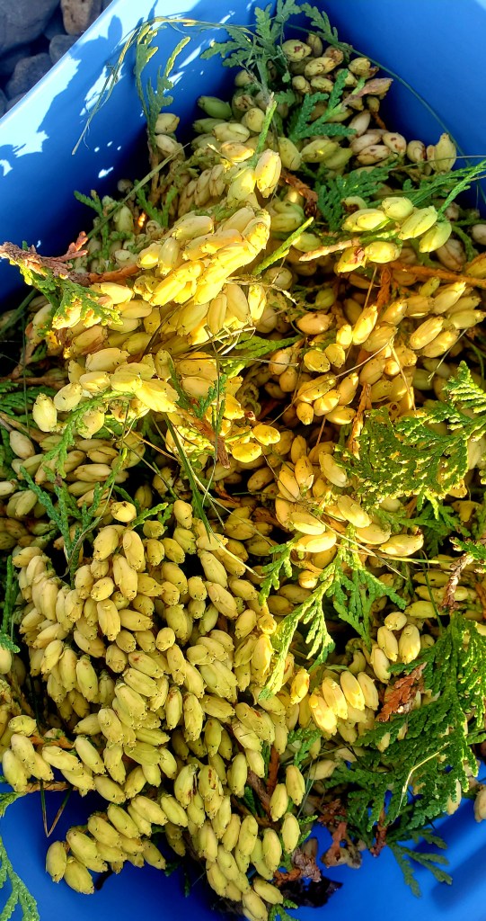 The Northern White Cedar drops seeds like this every 3-5 years. I “planted” hundreds of these in moist locations, in hopes they’ll escape foragers. It’s an experiment. If even a few sprout, I’ll be happy.