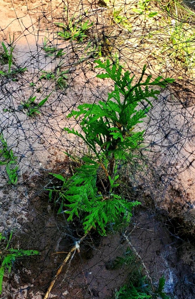 I found this baby cedar peeking out from a rock and transplanted it in an open location, covered by deer-deterring netting. Most of our old cedars are dying, and deer treat the young ones like candy.