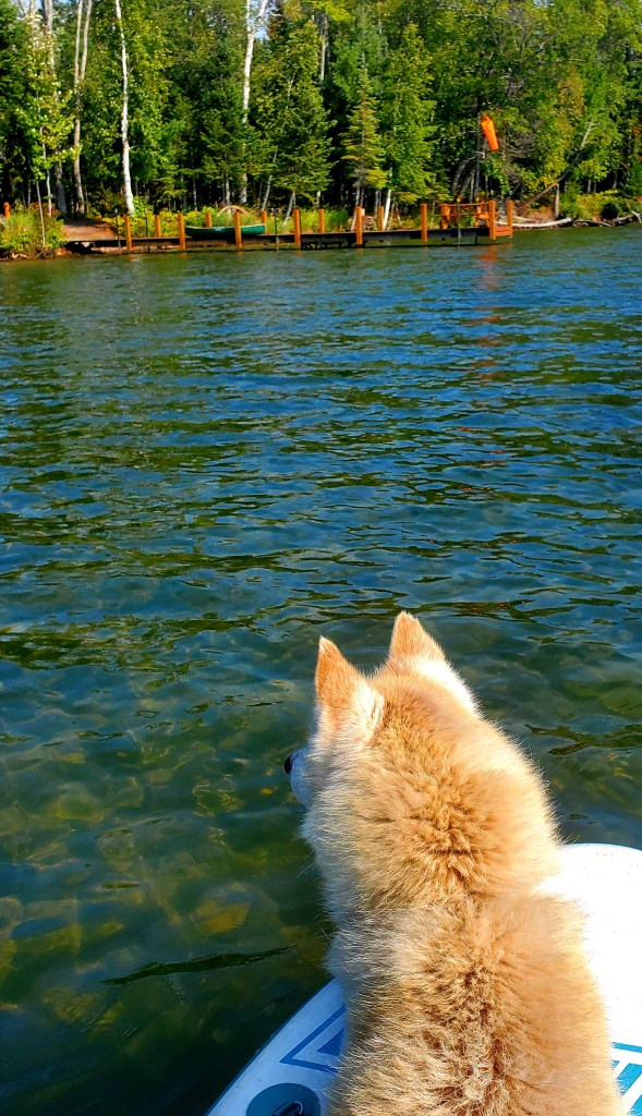 Entertaining Roscoe is one of my “camp duties.” đŸ™‚ He loves the paddle board! I didn’t have to urge him. He just jumped on one day, years ago, and has been begging to go out ever since.