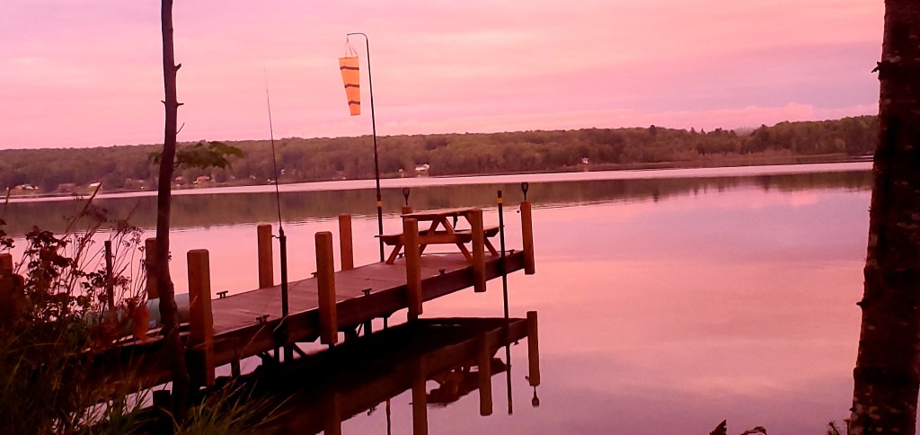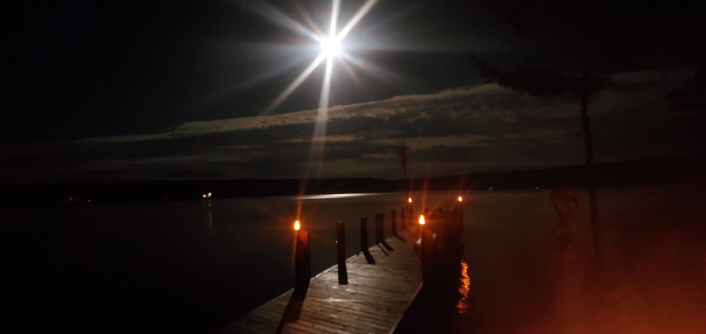 But with unobstructed views like this, I don’t miss it long! September weather is so changeable, which keeps it interesting. This moon rise peeked out after a day of rain and wind. The water is so still that it reflects the solar flames on the dock.