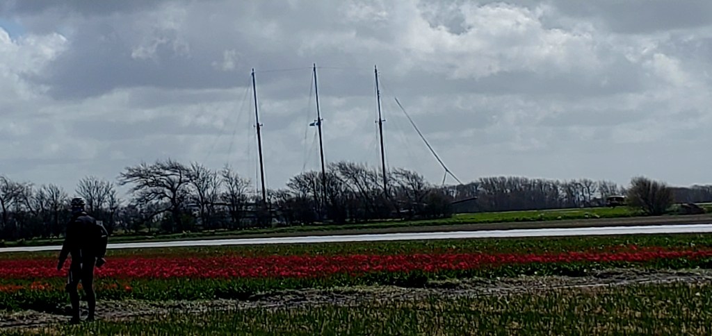 It looks like three tall sticks, doesn’t it? That’s our three-masted schooner, traveling through a narrow canal as we bike along nearby.