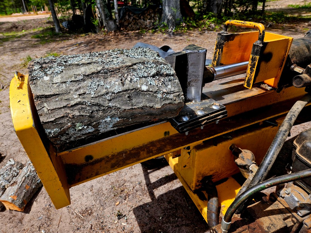 Meanwhile, I’m splitting logs left over from our latest tree-cutting last winter. (There’s always trees to take down in this rough woodland with strong winds and rough winters.) It’s such a powerful machine. The hardest part is getting the heavy chunk of oak onto the splitter.