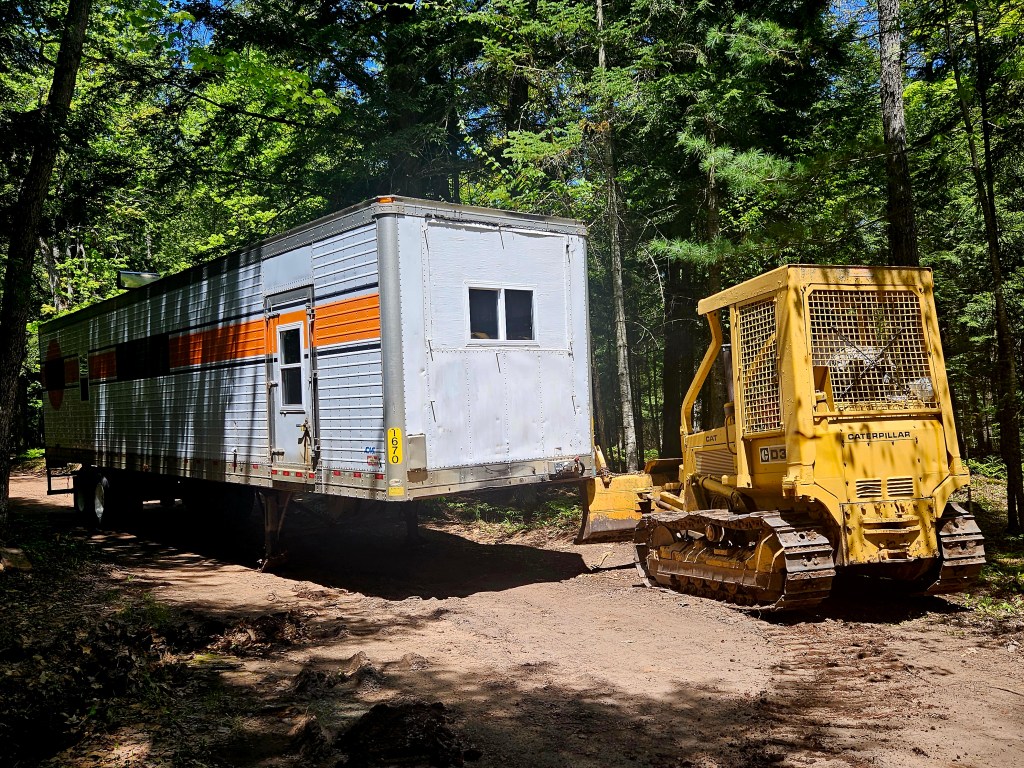 Jeff’s tiny woodsy cabin, less than a mile away, will get ignored this summer but he did make one big advancement today….a new “garage.” That’s how he plans to use this 48-foot trailer that he bought for $3,000 last winter and transported up his camp road today, with the help of a neighbor and his bulldozer. The trailer was once used for transporting refrigerated goods. (Backwoods folks excel at re-packaging, re-selling and re-using stuff. It’s impressive, not to mention economical.) Jeff added windows, shelves and a wood stove. It will serve nicely–though I wish I could figure out how to paint it. White doesn’t go very well in the woods!