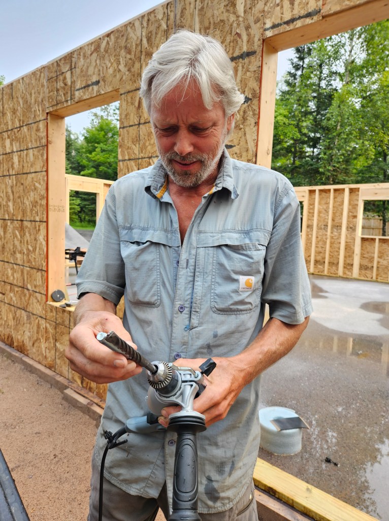 Jeff uses a hammer drill to insert wedge anchors into the concrete (which was poured weeks ago). The anchors will attach the walls to the foundation. In “the old days,” Jeff says, you inserted anchors while the concrete was still wet and somehow lifted the walls up onto them.