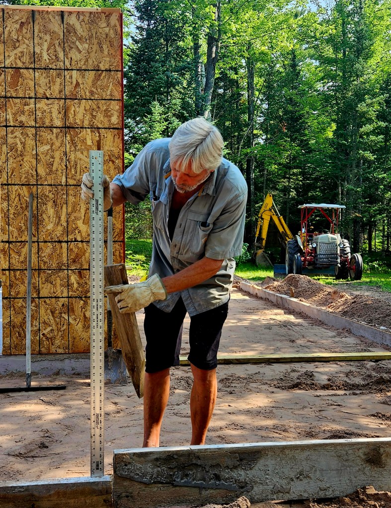 When you’re building your own cabin, you need to make sure everything is plumb (vertically straight) as well as level (horizontally straight). So I put my eyeball up to the old transit, taking care to not nudge it and thus disturb its settings, while Jeff holds a yardstick up for me to focus on and read out the number. And so my education in DIY construction continues…