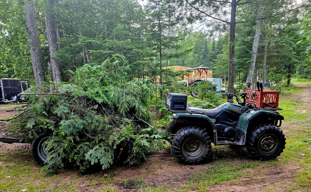 Meanwhile, I continue to expand the view around the emerging house by removing small trees (at least 20 so far) and cutting low-hanging limbs of large trees. I’ve been reluctant to cut many trees but now can visualize the need. I hauled this load to the big burn pile near Jeff’s camp, a half-mile away. I grunted a lot while trying to throw these limbs up onto the tall pile instead of alongside it, as encouraged by Jeff. (A tall pile will burn better than a wide one, I suppose. It’ll be burned in the winter while snow is on the ground.)