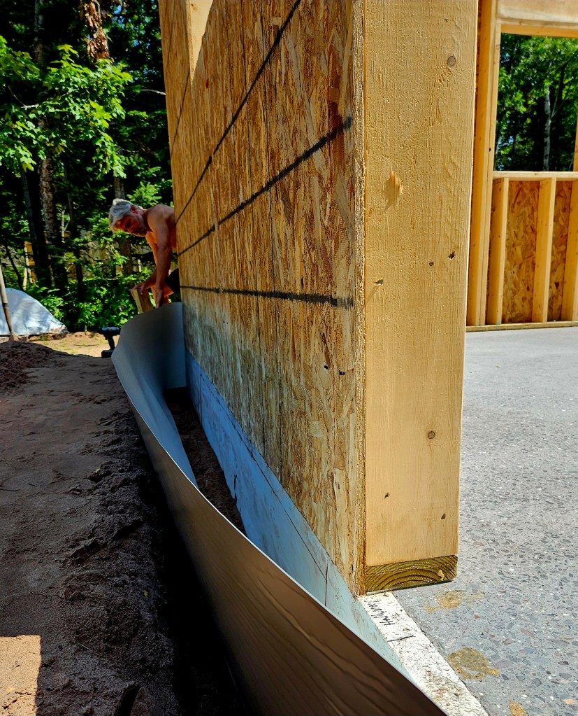 Adding trim coil to the bottom of the walls helps protect against moisture and insects. This thin aluminum with a special coating isn’t heavy but is awkward to maneuver.