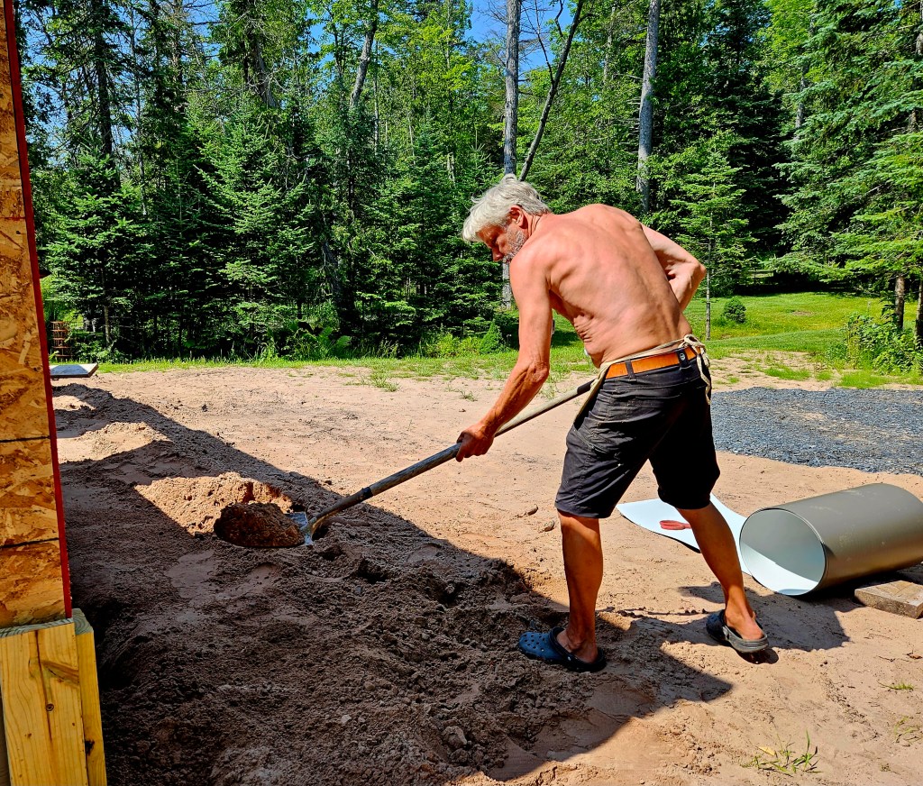 Since this is mostly a two-person project, I help out where I can. I admit I get grouchy when it gets hot or buggy, and take frequent breaksThis is one place I take breaks. I moved my tent onto the septic field yesterday, wondering if anyone else uses a septic field that way. (You can’t put anything on top of it. Other than a tent.)