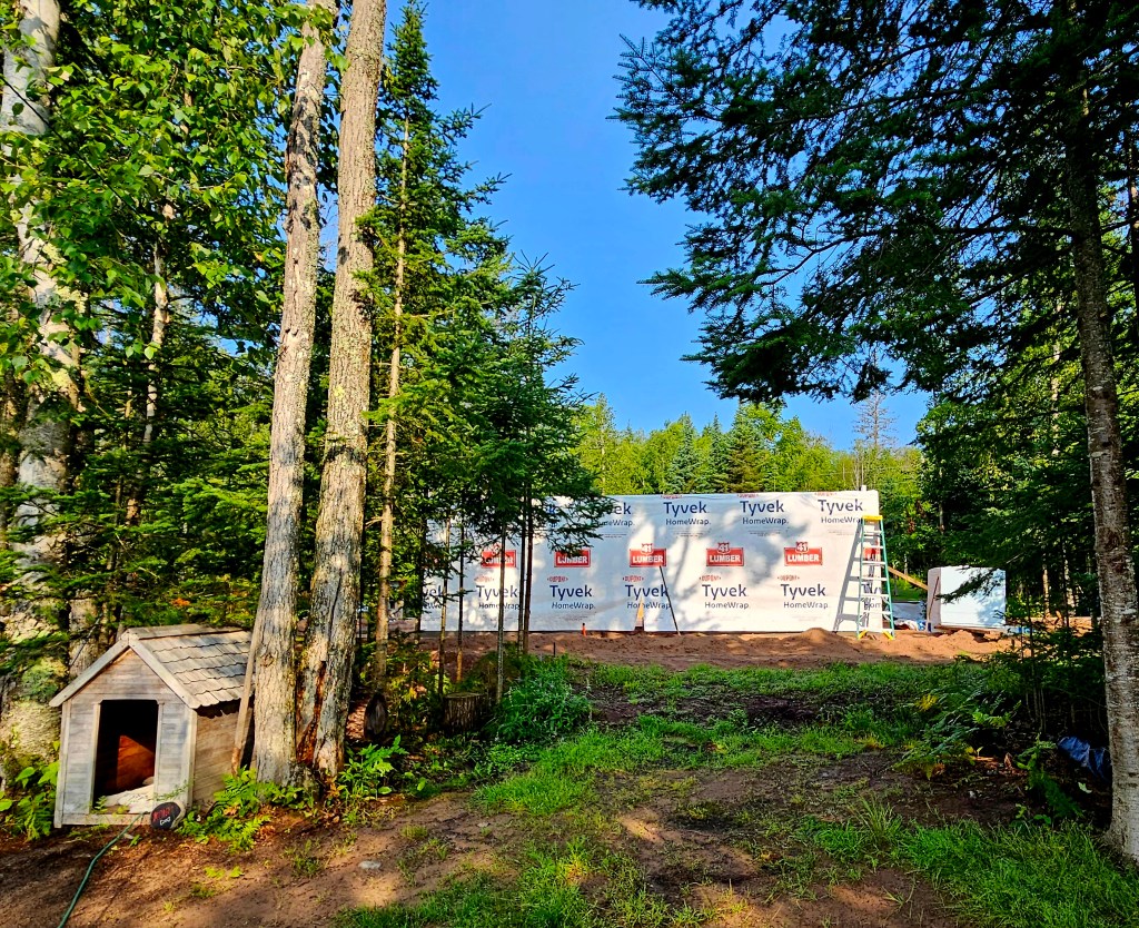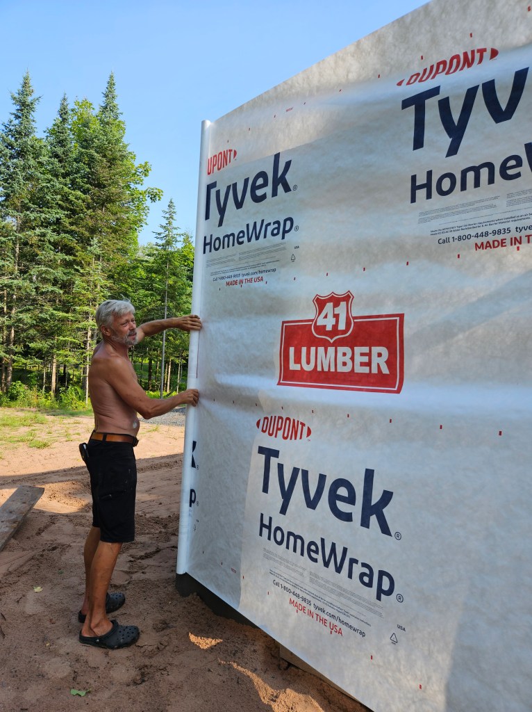 Before a house is roofed, it should be wrapped. So say the construction experts. So we did, pulling this light-weight but strong stuff across the walls and around the corners, then stapling it into the wood frame. Each roll was 9′ x 100′. We managed it, between the two of us and with the help of ladders, but I’ve never been more conscious of my height disadvantage.
