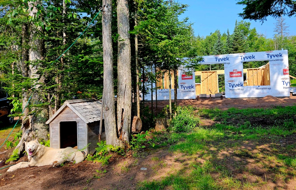The “stuff” is Tyvek HomeWrap, made of high-density polyethylene fiber. It allows moisture to pass through – in both directions – which helps prevent mold and water damage. (I can’t quite figure out how it keeps moisture out while also letting it escape…same as the high-tech clothing I like so much, which is both waterproof and breathable. Material science is so awesome!)