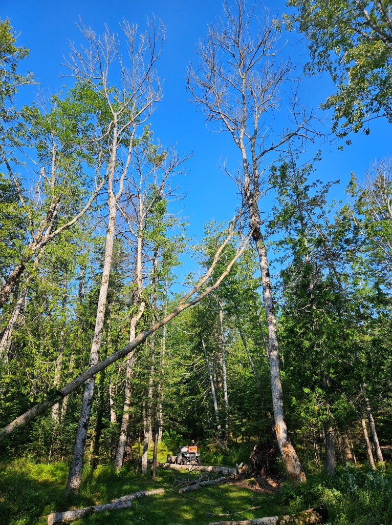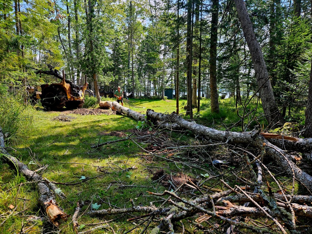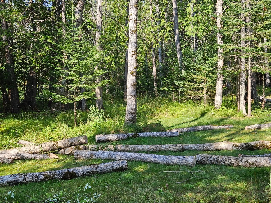 We cut down three more trees after the Iron Mule arrived and will continue tomorrow. It’s my job to pick up the mess after Jeff removes the logs. You can see Huron Bay in the background. I’m sad these trees have died, but we can do something with the open space left behind. We were planning to build a woodshed here, but maybe something bigger…? We’ll think more about that when the house is done!