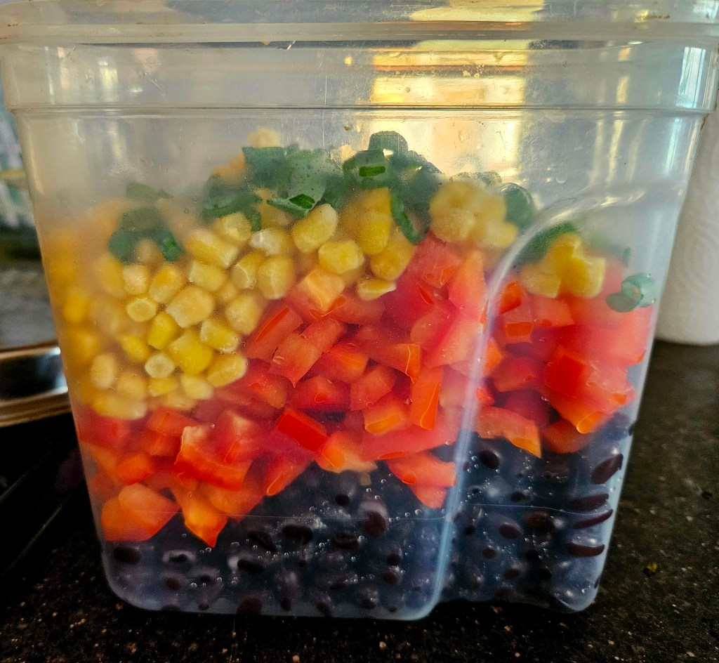 Eating healthy is important any time, but especially with the kind of work we’re doing. A camper isn’t convenient for complex dishes, even if I wanted to make them. This is an easy favorite…a salad of black beans, red pepper and frozen corn, with spring onions that I grow in a pot, a good dose of garlic, and balsamic vinegar. Delicious! (You can add many options but we like it simple.) I store it in this rectangular pitcher and just pour out as needed.