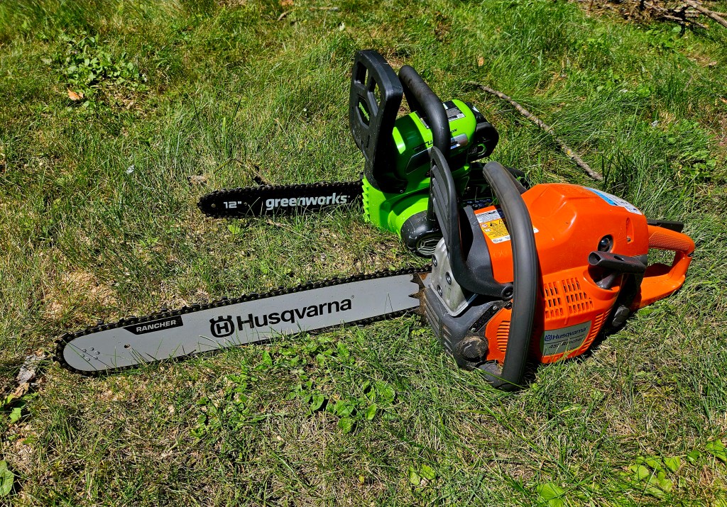 His-and-hers chain saws! (Guess which one is mine. 😉 ) I got Jeff a new one this week, and he’s delighted with it, too. He has three already, but all are used and in various stages of disrepair. He deserved a new one. After all, they are essential to the clean-up of Camp Many Moons…