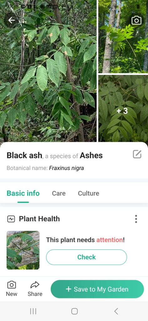 The app called “Picture This” identified the dead trees as Black Ash, not Dutch Elm. It’s a handy app, and free unless you want to save your data. It also told me that this plant needs attention! Um, yeah….too late….