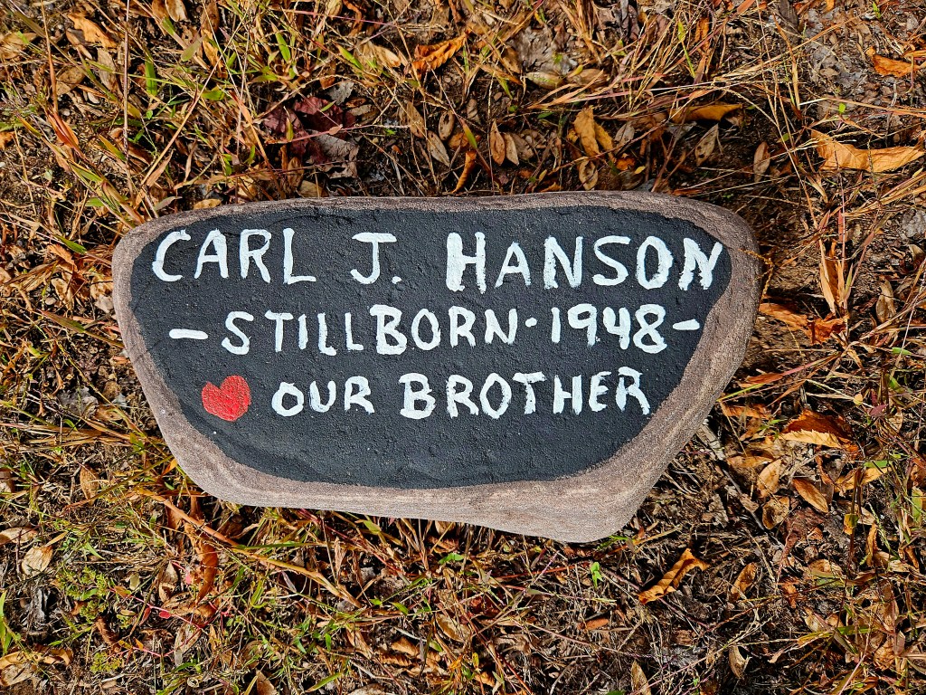 My brother Carl, who left my mother’s womb ten years before me, is buried in the same cemetery. I remember visiting his grave as a child but his marker is long-gone. I painted a simple stone and placed it in the infant’s section where he was buried. Family matters…and stillborn children are part of my family’s history, like so many others of that generation.