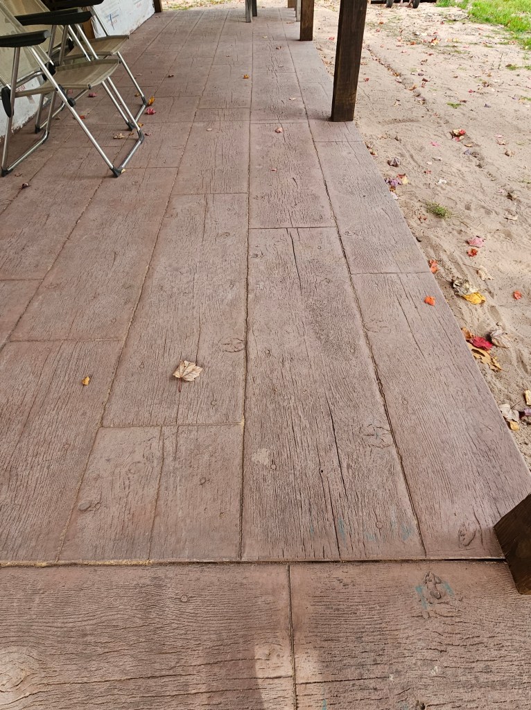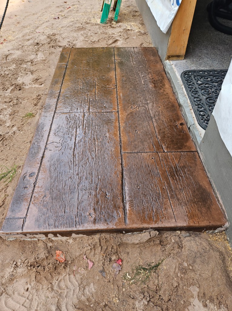 Speaking of doubt. The concrete floor and patio have caused me some of that. Neither looks as I hoped, weeks after their completion — at least not yet. The patio is still more pink than brown, even after pressure-washing, as you can see here. But, wait!