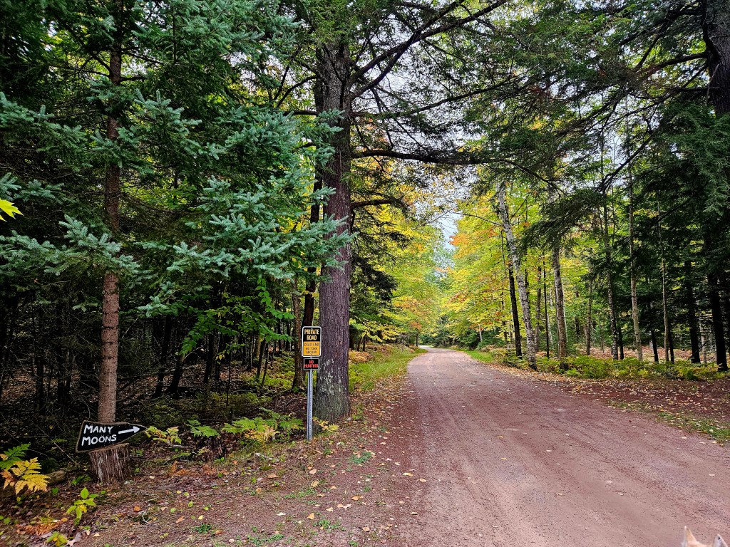 The road to camp is starting to look like fall. Notice the rock “Many Moons” sign on lower left, sitting on a stump? It’s years old now and holding up well. That acrylic paint works! We added the “private road” sign a few years ago to discourage explorers. (Yes, it really is private.)