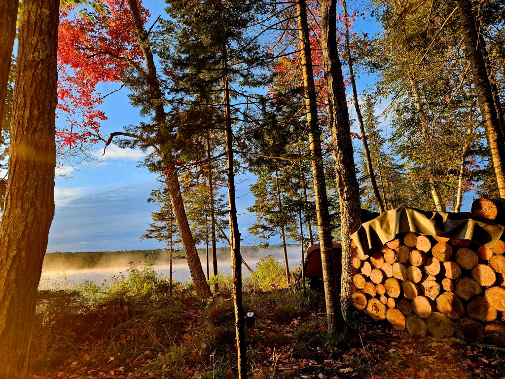 Sunrise in autumn and winter has a different quality, since the air is so clear. See the mist rising off Huron Bay? That wood pile is one of many at Camp Many Moons, since we’ve cut down so many trees. It will all get used eventually.