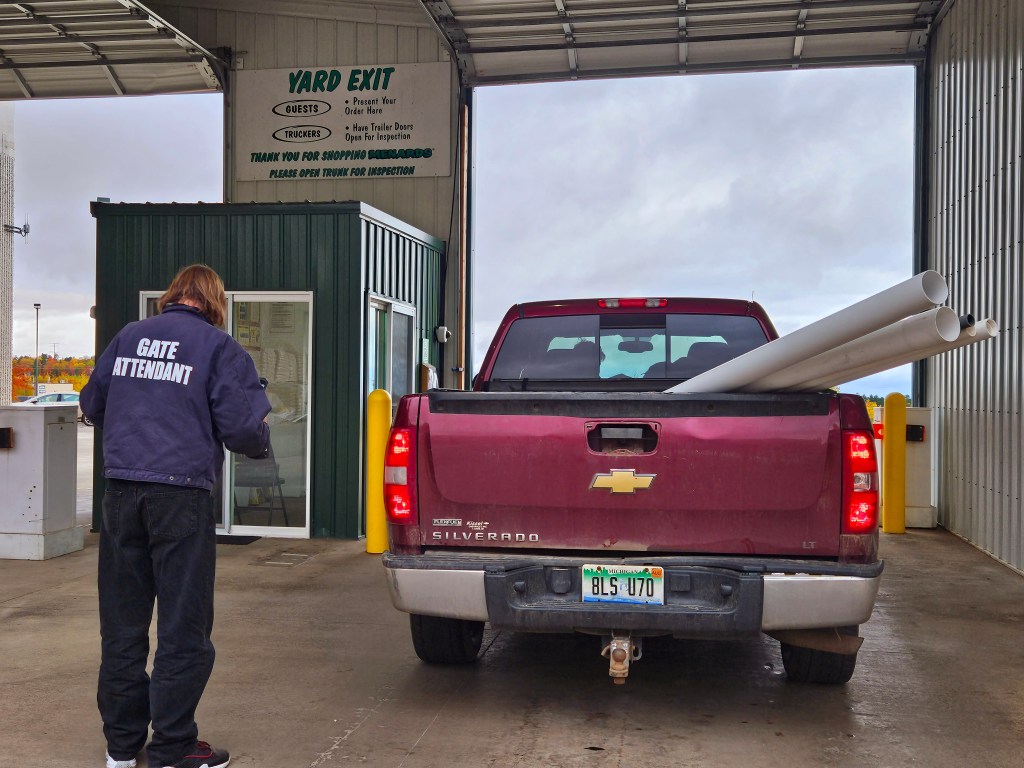 Once your truck is loaded up with supplies from the outdoor yard, it’s checked against your receipts before you’re allowed to exit. (I’m learning the process of buying construction stuff!)