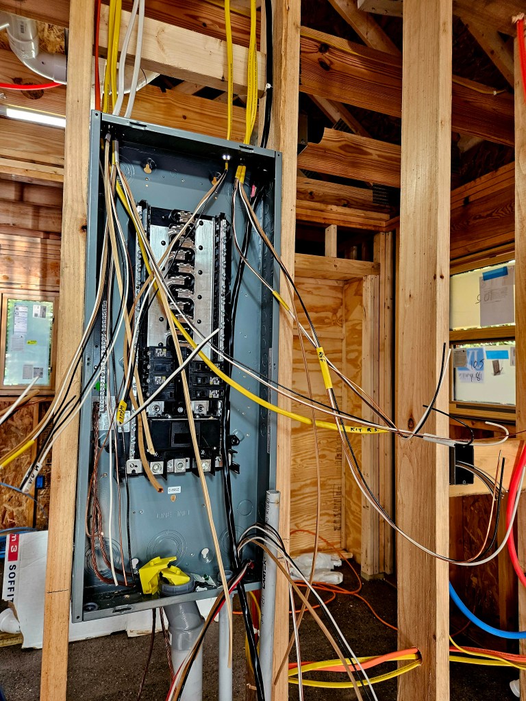 The electrical control panel is a mystery to me, even though electricity is our family business. My Dad wired buildings all over my hometown, and both brothers fell into the same. (My bicycling brother is an electrical engineer who still takes jobs all over the country.) This brother laid at least 800 feet of wire to all the rooms and porches. Jeff placed at least 60 boxes for outlets or switches. Who knew a small house would need so many? (In “the old days,” they made do with far fewer.)