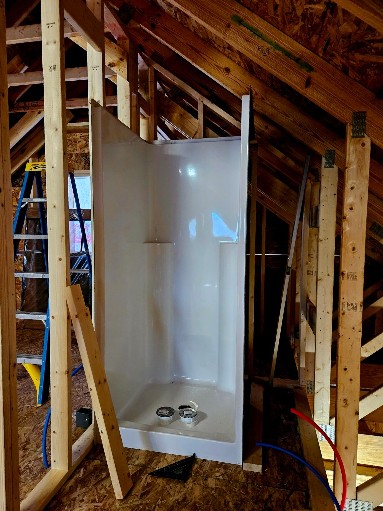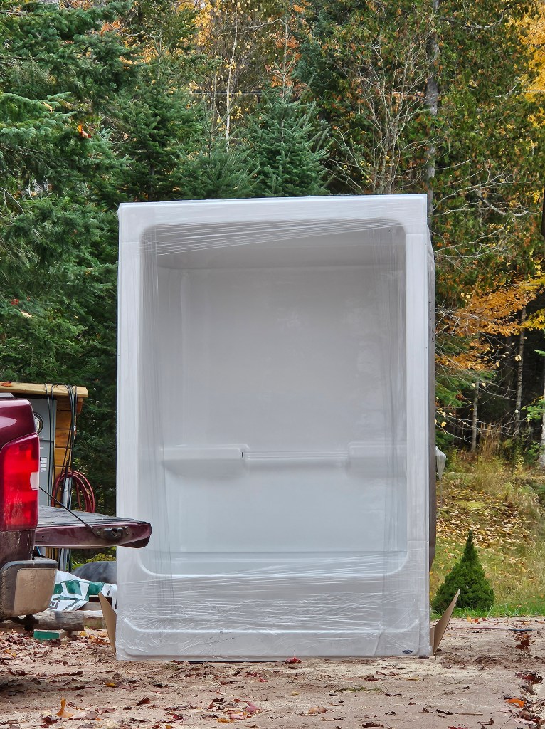 And then, this! A one-piece tub/shower combo, made locally from a single sheet of acrylic, with an integrated top and interior light. I had different preferences than Jeff here too, but again let him “win.” Besides, I grew weary from researching options and prices, especially on deadline. The company made it quickly, for which I’m grateful. It looks huge there on the ground…