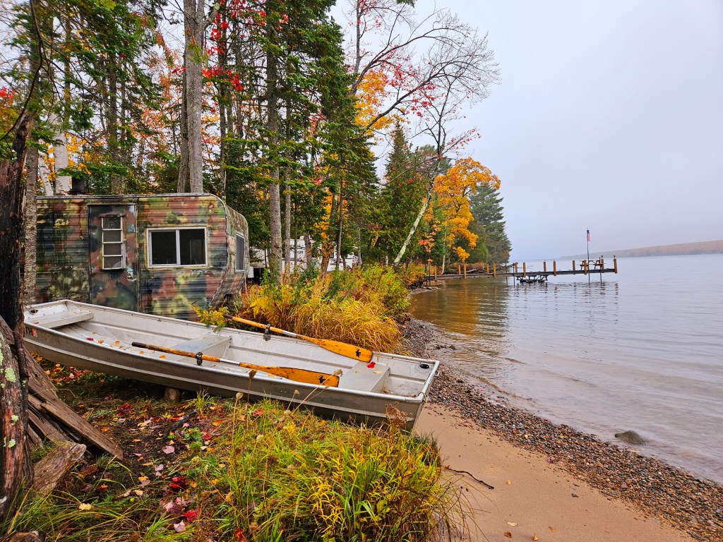 Today, the colors are faded and grayness has set it. I write this blog from that camouflage-painted camper trailer, which functioned as a hunting shack until it was moved here. It has a small wood stove inside, which I light almost daily. I hope to take out that rowboat a few more times before it’s pulled in for the winter.