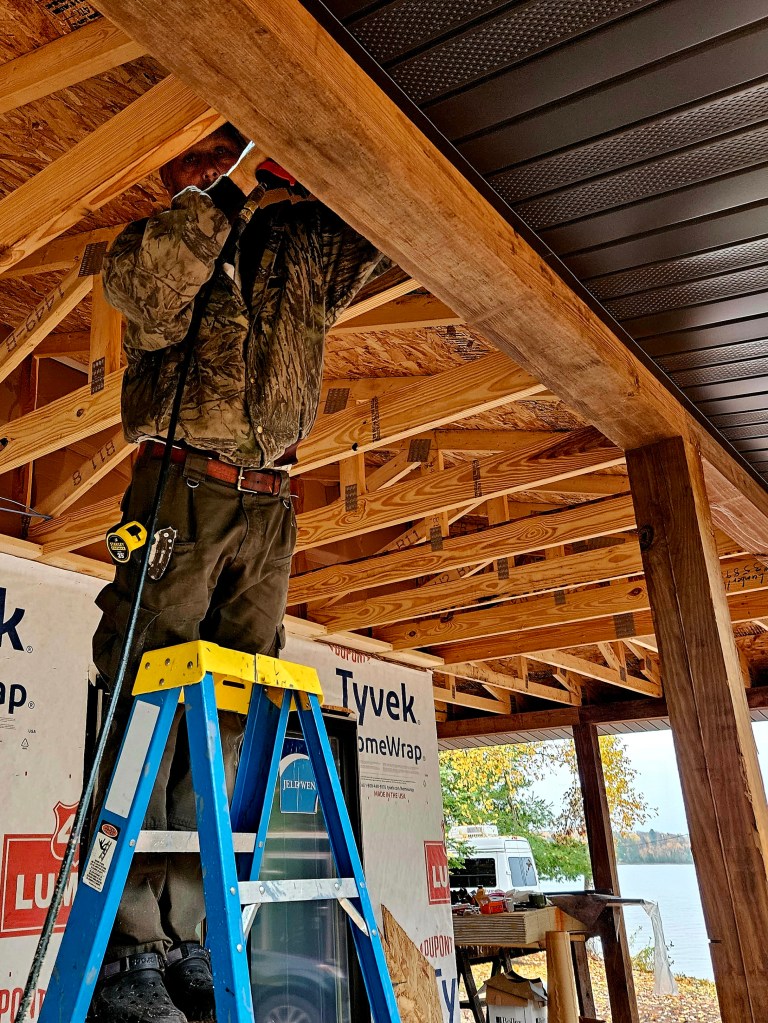 …and Jeff was soon back at it, closing up the holes of the porch roof in preparation for insulation sometime next month. (We hope to have a wood-burning stove inside soon, to give heat for winter work. No heating system will work if the gaps aren’t closed!)