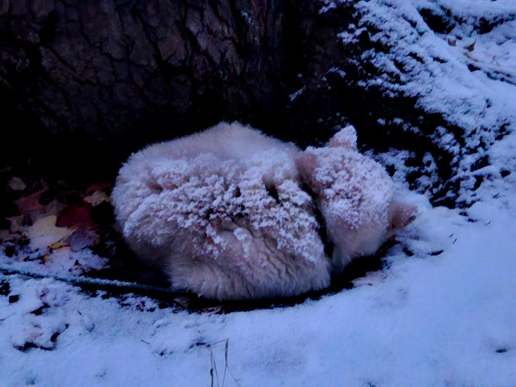 …and I went out to find Roscoe, who moved up here yesterday. There he is, tucked up to his favorite hemlock. It’s in his genes! Working huskies make their beds in the snow this way. Roscoe has a dog house but prefers this!