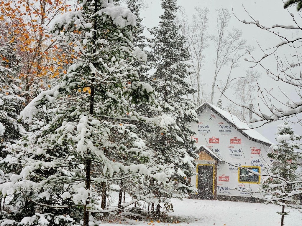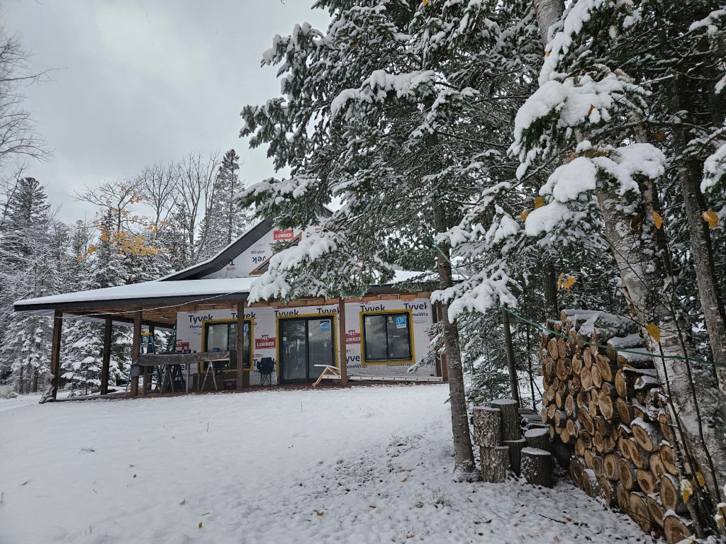 I tell myself I’m resilient and productive. So I’ll continue to be both! But it is harder. Shoveling snow and washing dishes in the bay is the easier part. My paperwork — which tracks the building process, including inspections and expenses — is a mess in the tiny 2nd trailer that I use as an office. (Jeff’s cabin has no electricity, WiFi, or cell signal.) And we are both fighting bad colds. But! We are close to ready for the next round of inspections! Jeff is out there right now, in 32 degrees, banging lighting boxes into the porch ceiling. If he can do it, so can I. This is the time to buck up…for awhile longer, anyway. Transition photos and captions follow.