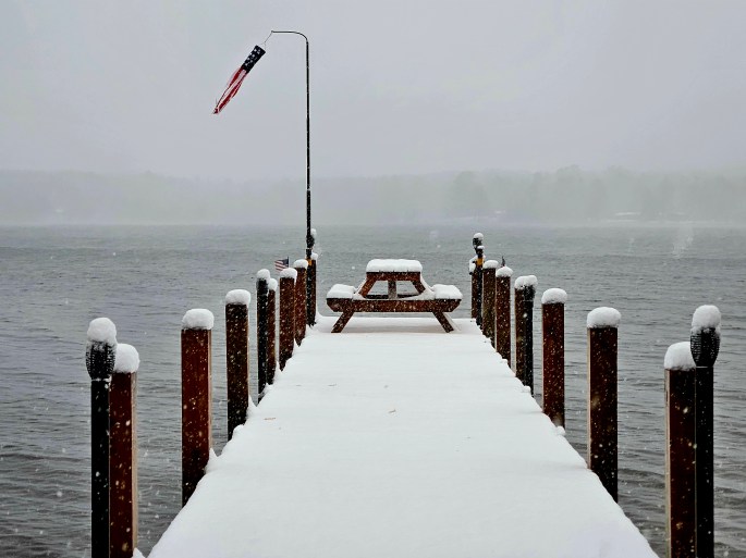 The dock, which gets so much use in summer, looks forlorn in winter. I measured 4″ and the snow was still falling. Most personal docks here are moved to land for the winter, and so this one will be. That will be easier if it’s not covered in snow. So I swept it. (Easiest snow-removal ever! Just shove it over the side into the water.)