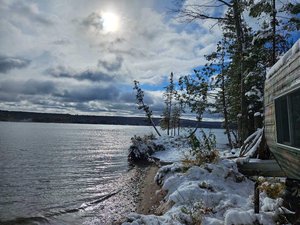 Winter arrived early. I usually greet the first snowfall with delight, no matter when it comes–but this year, not so much. When you’re building a house and therefore don’t have one yet, winter makes things more difficult. Prettier, but also more difficult. However, here it is. So I cleaned out the trailer, climbed a ladder to sweep snow off the awning before rolling it in, and moved myself and the pets to Jeff’s off-the-grid tiny cabin in the woods. It’s just a mile away but feels farther as I move food and pots and clothes and cat crate. I’ll still use the trailer for daytime use and occasional cooking, but Jeff has winterized it (drained the water and replaced it with antifreeze) so I carry water from the well and wash dishes in the bay. Sand is a great cleaning agent–but when the bay freezes, that will be the end of that.
