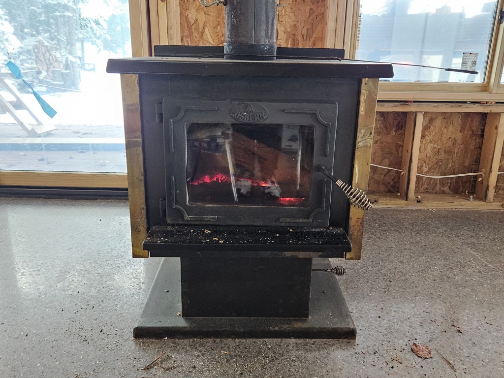 …. which is inside the otherwise-empty new house. We don’t have a heating source yet, so this is necessary to keep inside work going. Adding wood to the stove was the last thing I did before heading up into the woods last night and the first thing I did after coming back down to the waterfront this morning.