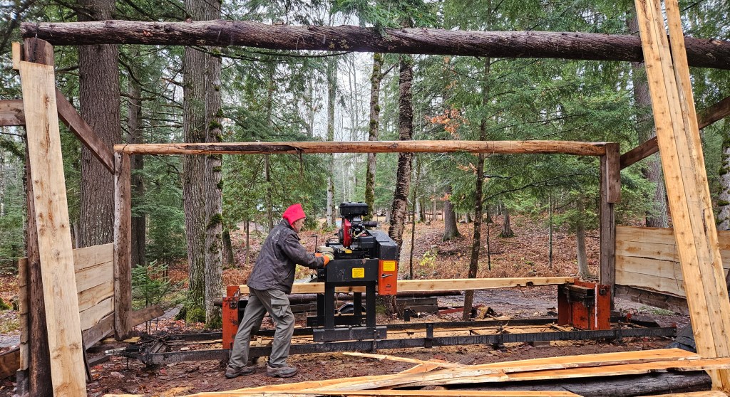During the dismal sleet-snow mix, we took a break from the house–the first time since May–and what does Jeff do? Plays on his sawmill! This is fun for him! He’s creating a shed for it.