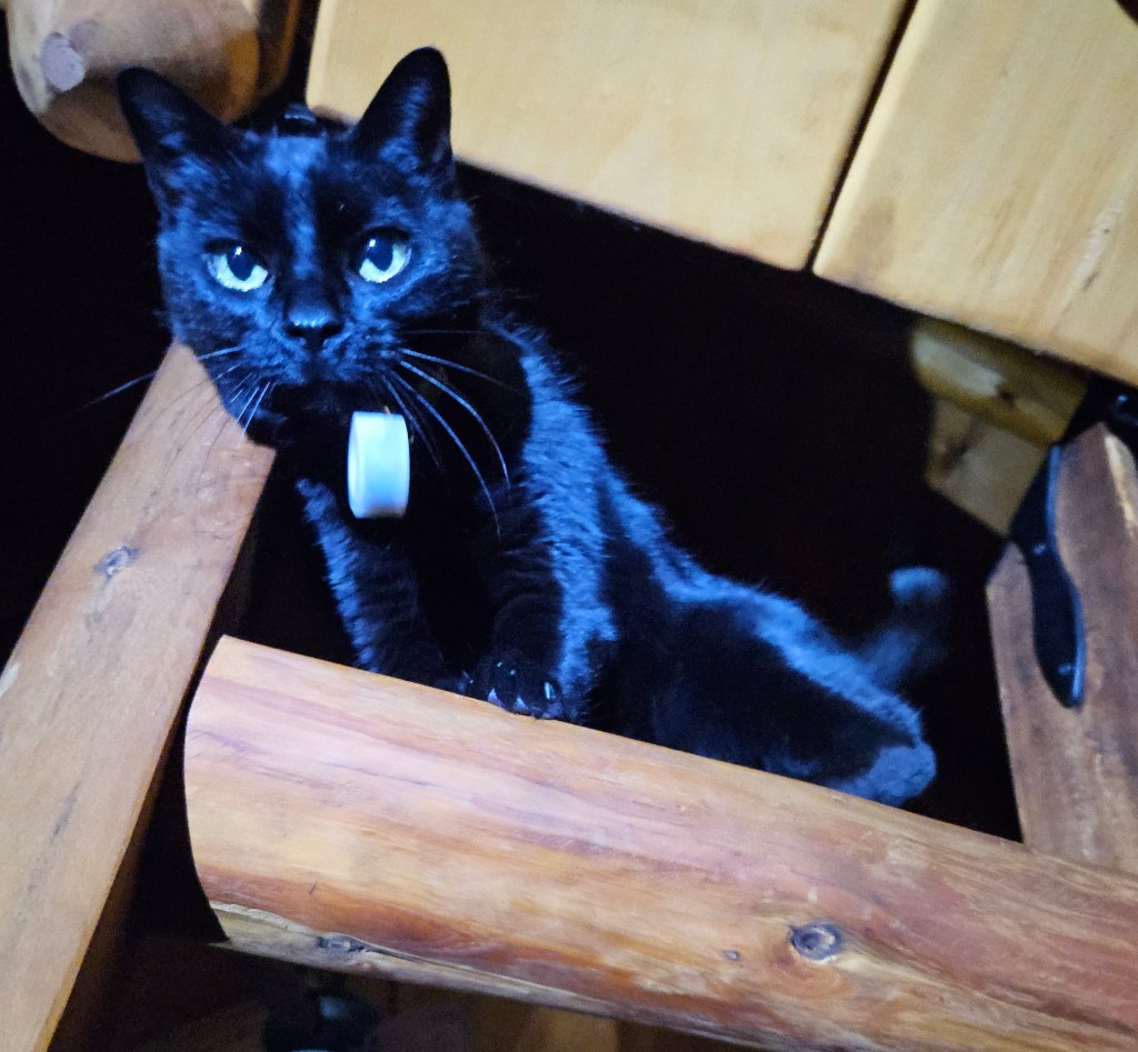 Boo can live anywhere but seems to prefer Jeff’s cabin. How can I tell? The noises she makes! What a variety. I think she’s part Siamese but not sure, since I got her from a shelter. She’s wearing the electronic “cat tailer” that I keep on her collar in case she gets lost. She’s on the ladder that goes up to Jeff’s loft. I use that ladder too, because I sleep up there a lot. It’s tricky when you have to come down in the middle of the night to, ahem. I do it carefully, with a headlamp. (No electricity here.) Boo does it carefully, too. She has arthritis, so climbs sort of lop-sided; glucosamine helps. As long as she can do it, I let her. She also loves the trailer. Maybe because it’s on the water? I just throw her in her crate whenever we move. She’s used to it. We’ll be back in the car again soon, heading back to the East Coast.