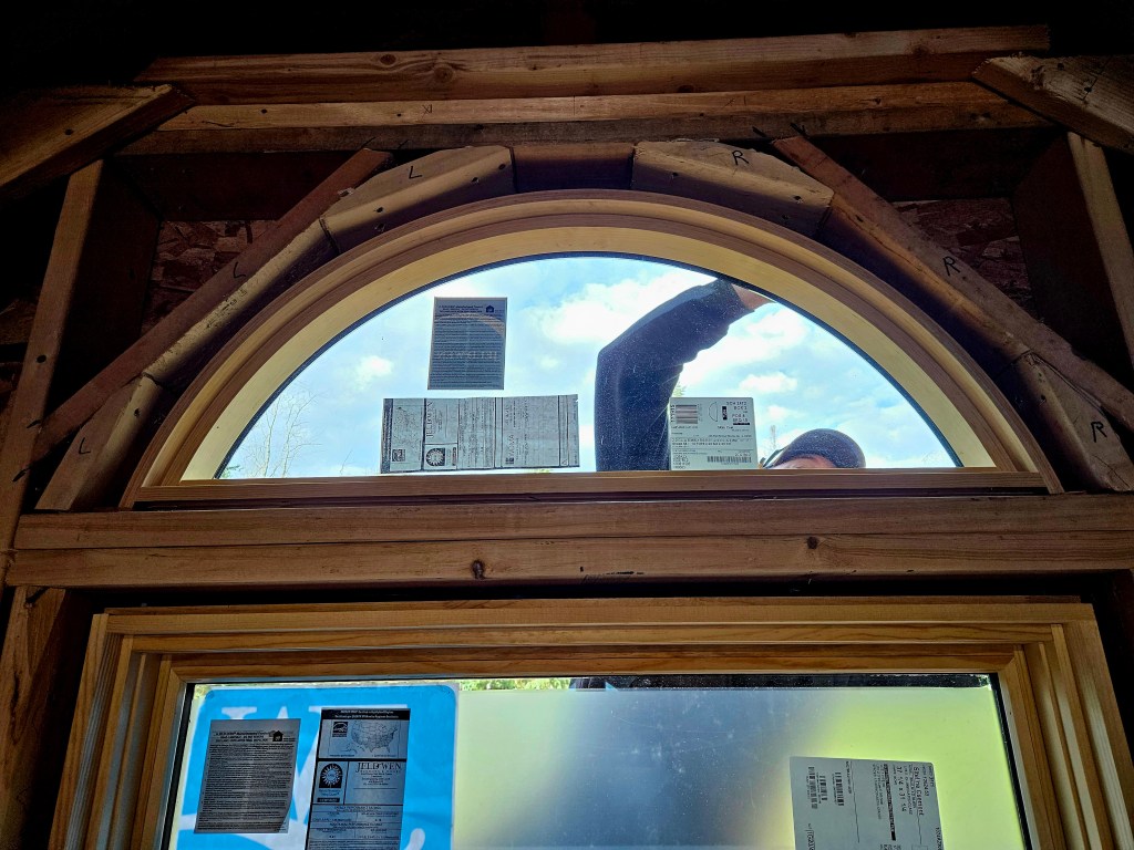 In go the last of 11 windows, delayed because I had to change them when we realized we need an egress in the loft. (Choosing and ordering windows was the single most stressful part of this process for me, so far.) I don’t know how Jeff made the frame for the “eyebrow” window, as I wasn’t watching, but it must’ve been tricky to create that curve.