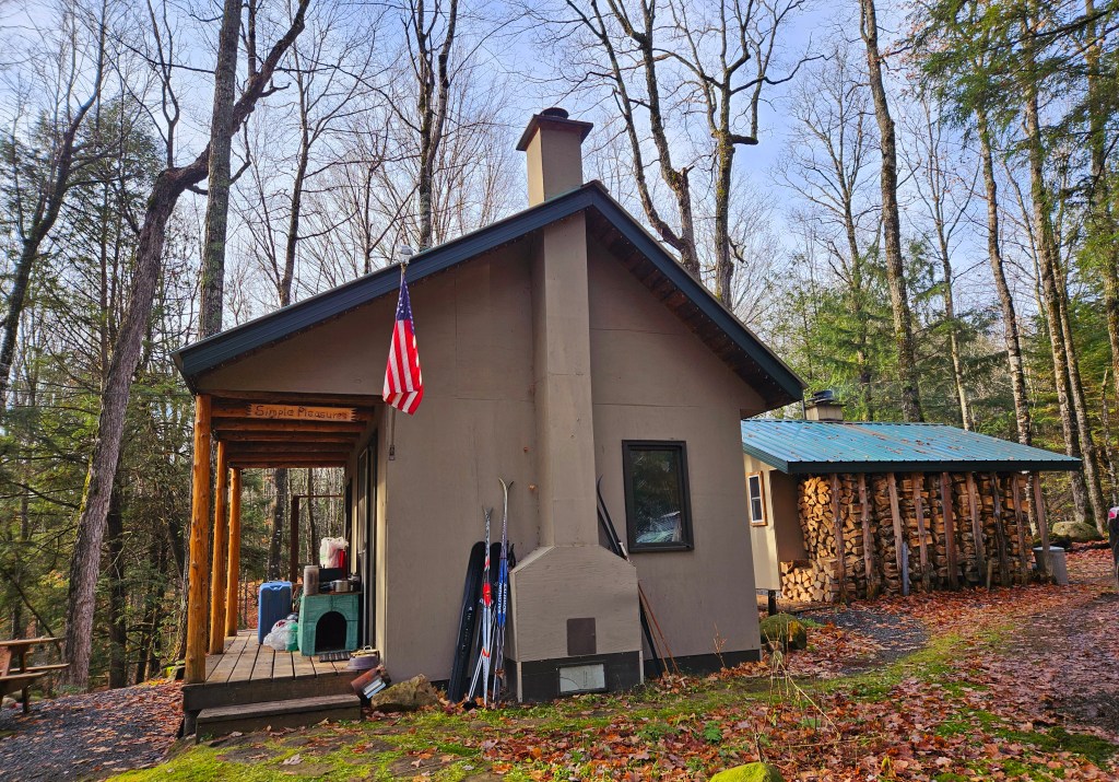 This is Jeff’s off-the-grid cabin, located inland. The cross-country skiis leaning against the wall may get used soon. See Roscoe’s dog house on the porch? It’s a sturdy cardboard box that Jeff painted. It’s strong and warm and Roscoe loves it. (His wood house remains on the waterfront.)