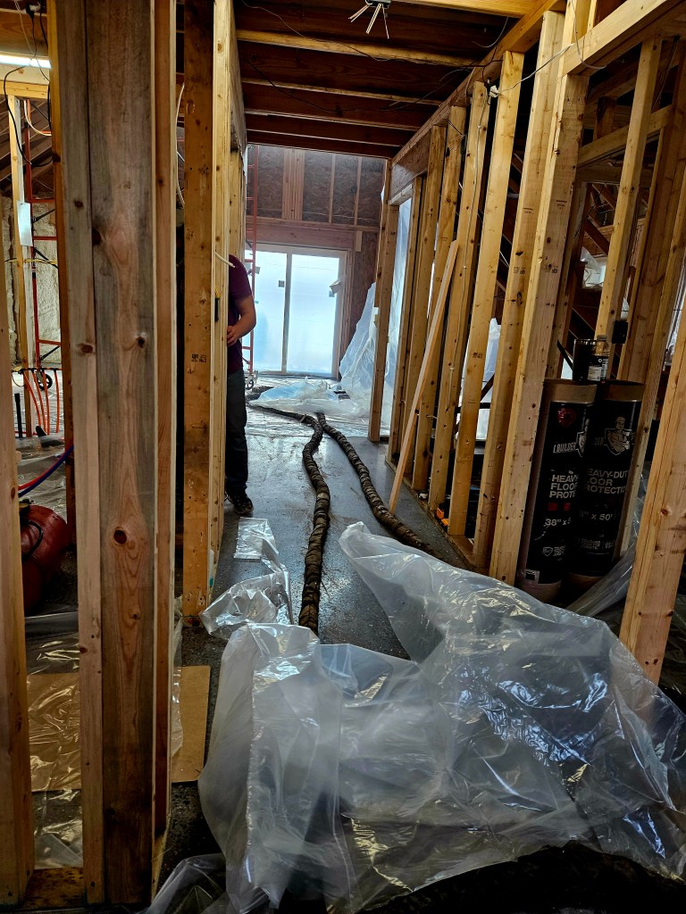 The tube carries ot into the house, where the workers have already laid plastic everywhere…