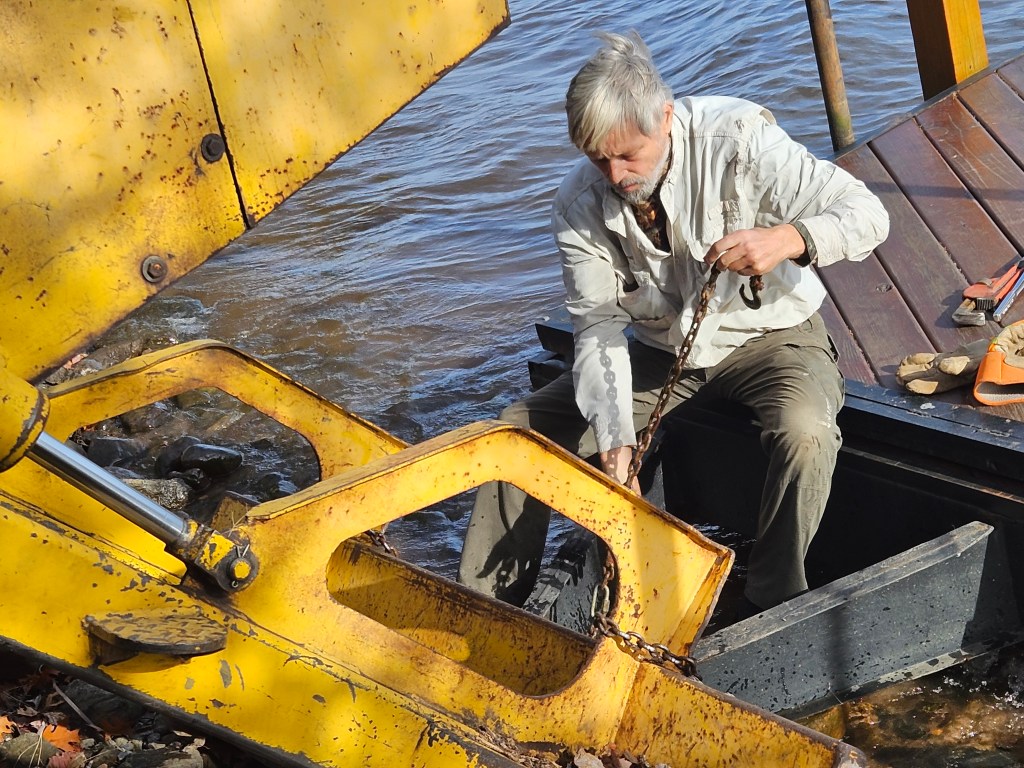 As the insulators worked, Jeff and I took the dock out of the water. It was easier than usual using his newest “tool” called an Iron Mule, or forwarder. (I guess because it, um, moves thing forward? Also backward.) I swear he almost giggles when he drives this thing.