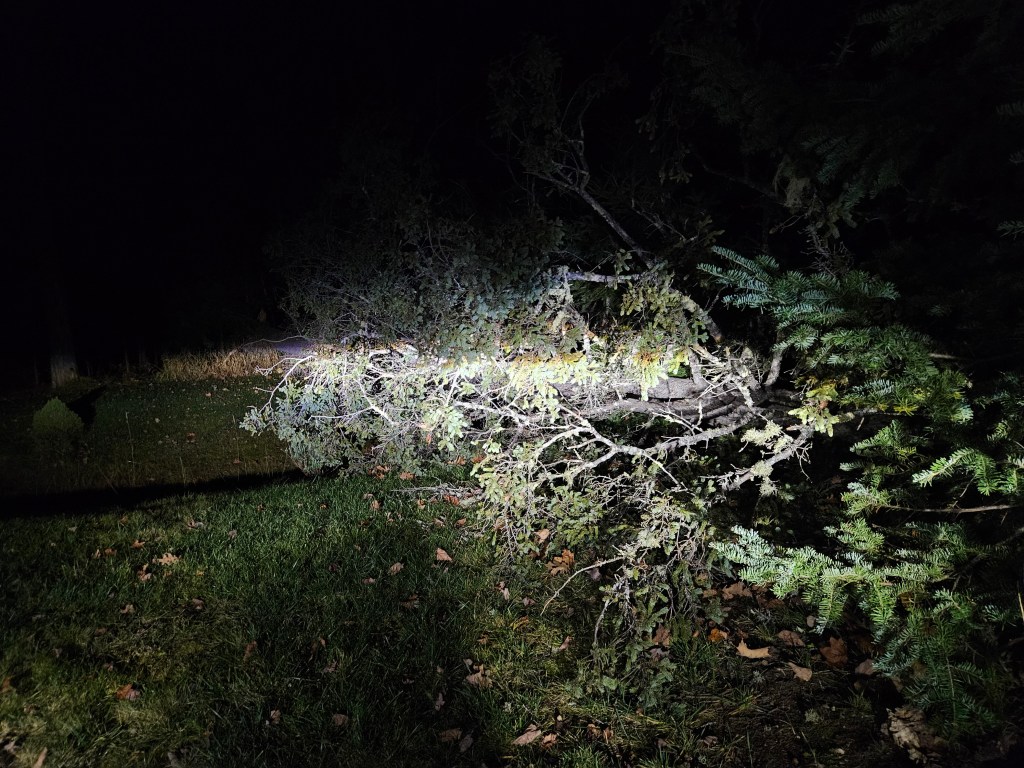 I mentioned the winds. Another tree down. Sigh. It came down just before sunset. I took this photo with a headlamp, and you can’t see how long it is. More photos later.