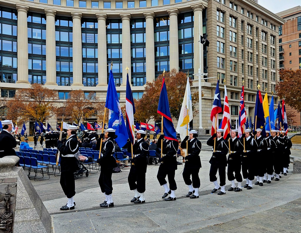 While Jeff was husting sheetrock, I attended a ceremony at the Navy Memorial in downtown D.C. to honor Pearl Harbor Day (Dec 7). As a Navy vet, I feel compelled to do this if I’m around, even though driving and parking are a hassle. It’s like showing up for a funeral. You just do.