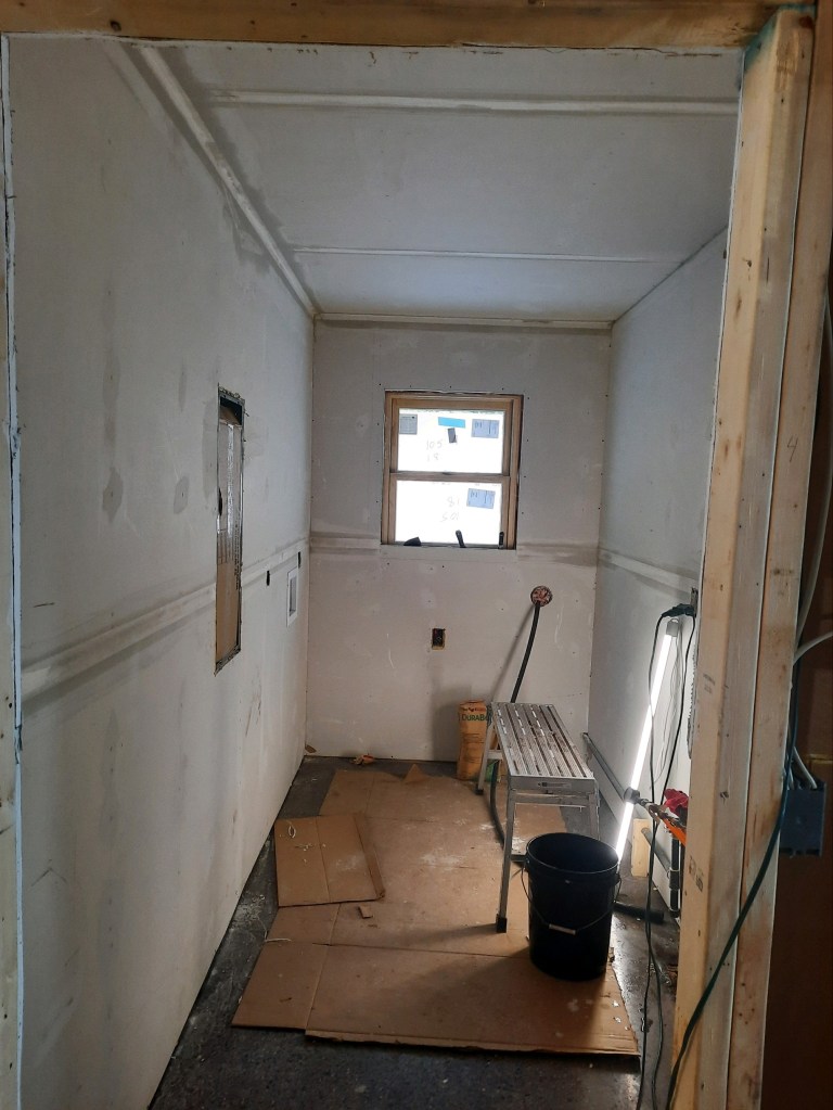 Back in Michigan, sheetrock (aka drywall) has been added to the mechanical room–a dull but essential aspect of new-home construction. It covers the bones of the house and adds structural support. Voila, a wall! Am I going to paint or cover with wood? Some of both…