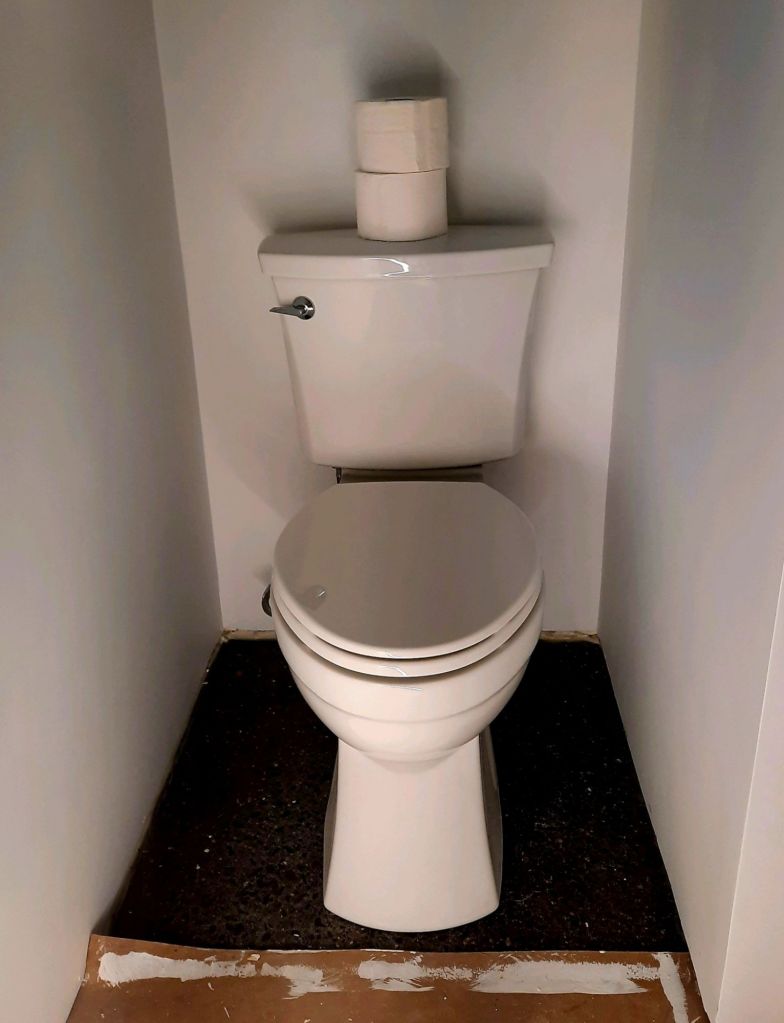 ….installing the toilet! (A Kohler, 360-degree-flush, chair-height, if you’re curious.) So now there’s heat, a working shower, hot water and a toilet. Ready for visitors? Not quite, but getting closer!