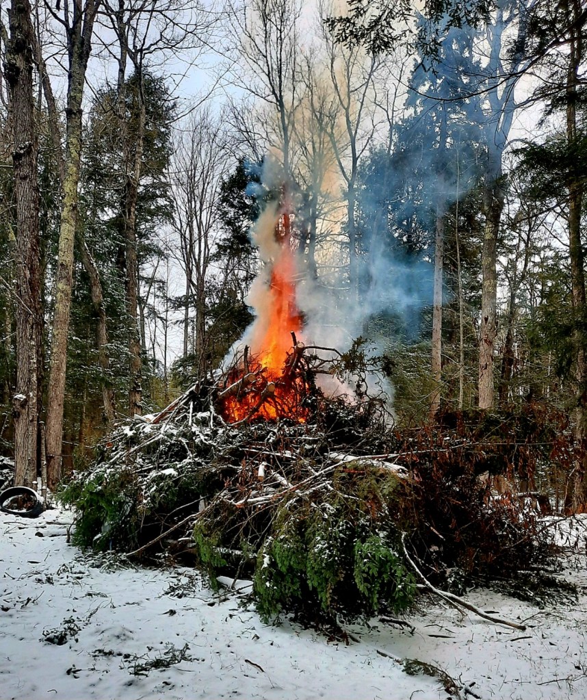 And today, he lit the burn pile. It’s an annual winter ritual because there’s always trees and brush to burn. (We have taken down so many trees in the past five years. I wish I had counted them, but well over 200 by now, including small ones.) The building process also creates waste, which is carted off to pickup trucks that receive our garbage at designated spots on designated days. Too bad we can’t put it in the burn pile.
