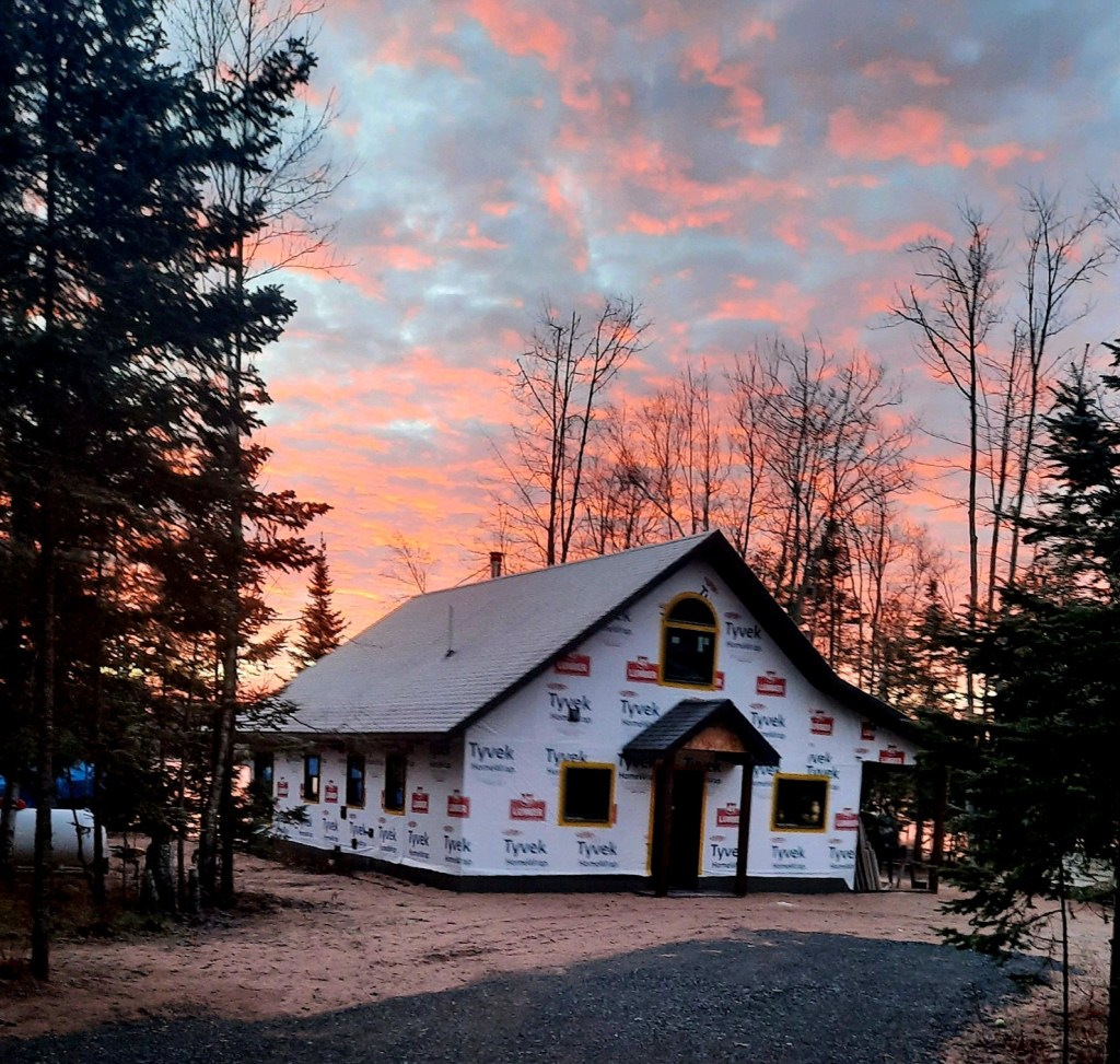 Speaking of building a house. Here’s the Cabin at Many Moons a few days ago, in an uncharacteristically brown U.P. winter. (It’s white today, though.) While I’ve been abed for much of the holiday season with illness and dental reactions, Jeff has been plugging along with interior work, including….