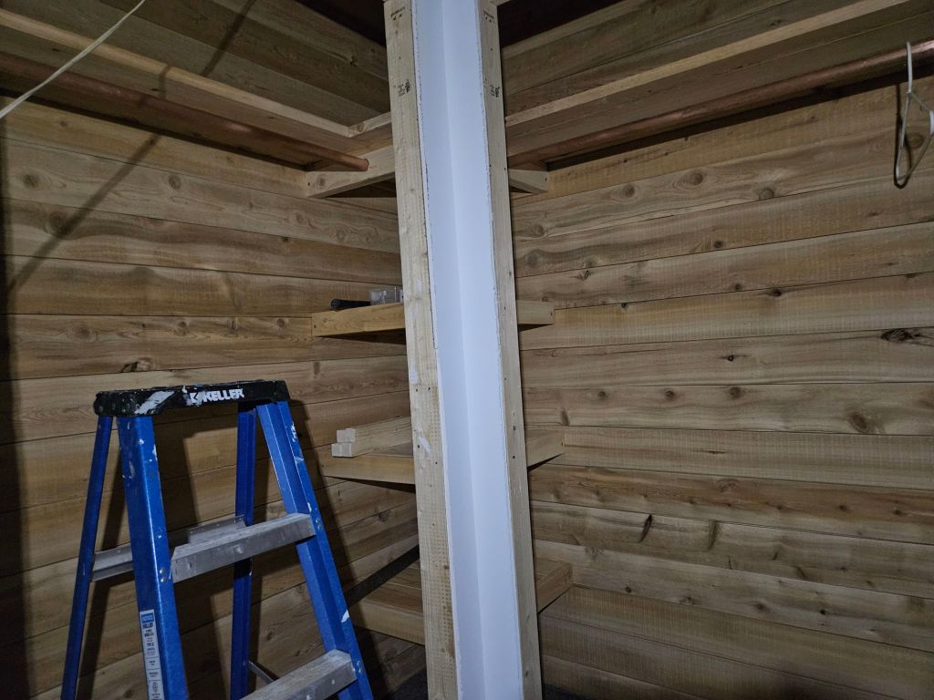Jeff also installed cedar lining in the bedroom closet while I was gone. Cedar-lined closets are a kind of luxury that I don’t care that much about (even though they do deter moths for awhile) — but it is very cool that this wood comes from trees we took down ourselves, which Jeff then cut on his own sawmill. Now that’s “local!” It fits my idea of a cabin that draws from nature.