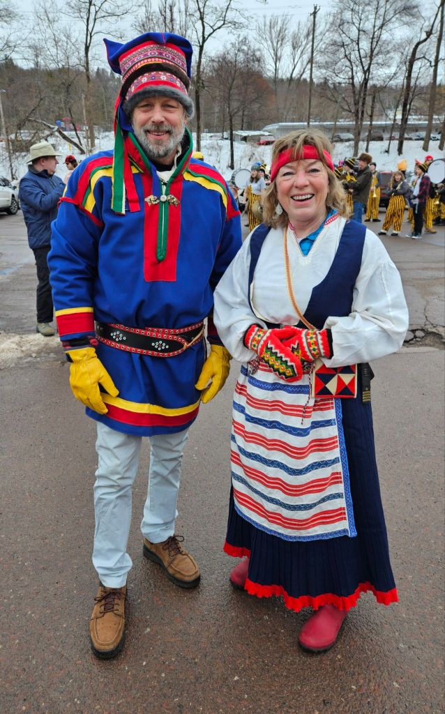 I picked up my costume the day before. Jeff got his less than an hour before! I’m wearing historical Finnish garb while he’s dressed as a Saami reindeer herder from Lapland. (Fun fact: my grandmother migrated from Finnish Lapland to even farther-north Norwegian Lapland in a reindeer-drawn sled. There’s a good chance I have Saami blood, though DNA tests can’t prove it.) He’s wearing his own pants and shoes, and you can see my blue down jacket under my blouse. It was in the mid-30s — mild for January, but not “warm!”
