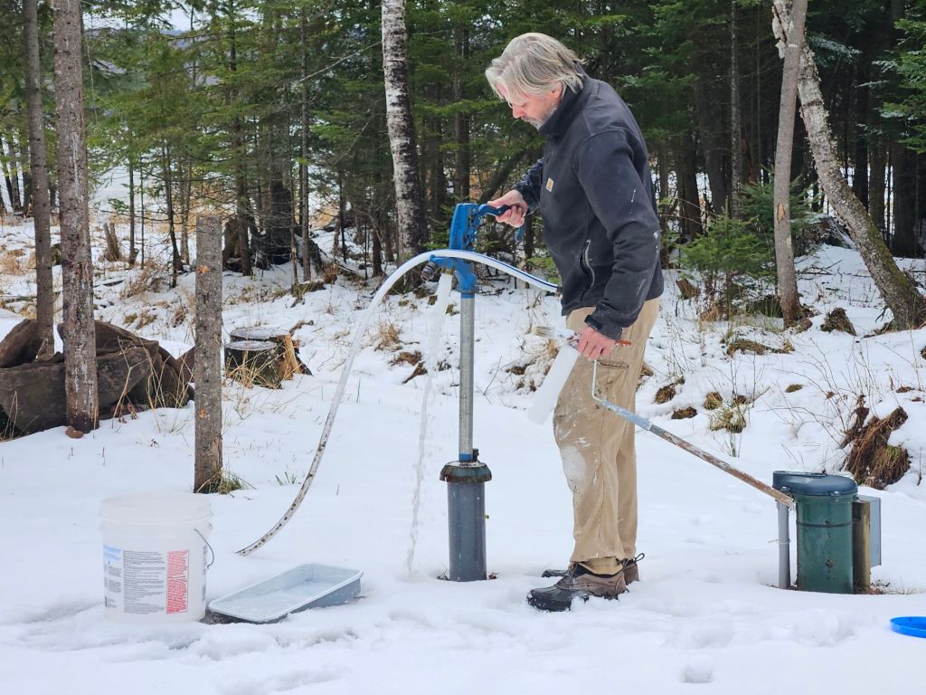 Jeff cleans the paint supplies at the well. Good thing it’s been warm enough for that, and we don’t have deep snow to trudge through. (So strange, for Feb.)